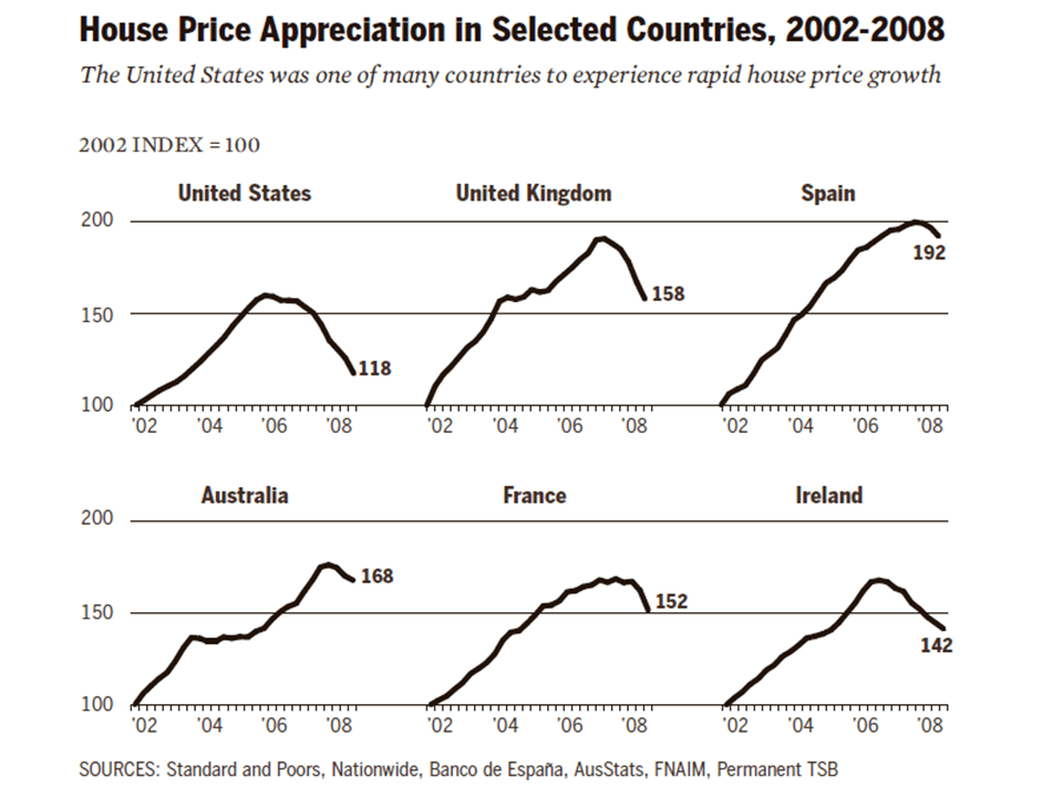 After the Dot-com bubble burst in 2000, there the economy in the U.S. and the world market briefly recovered. The supporting pillars for this were the indebtedness of private companies, growth in demand based on credit through private debt, i.e. the credit-financed purchase of individual means of consumption, and rising public debt. The upturn in the construction industry, which was stimulated by low interest rates and credit-financed demand for real estate, was central to the recovery of the U.S. economy after the turn of the millennium, which was largely driven by demand for individual consumer goods. This demand was based on mortgage loans totaling 5.8 trillion U.S. dollar, which accounted for approximately 40 percent of total private debt in the United States. Despite rising house prices, the generous granting of personal loans by U.S. mortgage banks also enabled financially weak sections of the overall population, especially the economically relatively poor sections of the U.S. working class, to afford to buy real estate, primarily to buy houses and apartments as owner-occupied homes.[78] However, the granting of these loans was not the cause of the upswing in the U.S. construction industry, but merely catalyzed it. Rather, the boom in construction was caused by an increasing investment of excess money-capital, released as a result of the long-term trend of falling national average rates of profit and accelerated accumulation of money-capital, into the real estate sector.[79] Since the tendency for the rate of profit to fall during the period of post-war prosperity was established not only in the United States but in all developed capitalist nations, the investment of excess money-capital in the real estate sector was also a common phenomenon in the capitalist centers. Accordingly, the real estate boom fueled by mortgage lending was by no means limited to the U.S., but took place in Europe as well. As a consequence, a speculative real estate bubble formed, especially in Great Britain and southern European countries such as Spain (see Fig. 6).