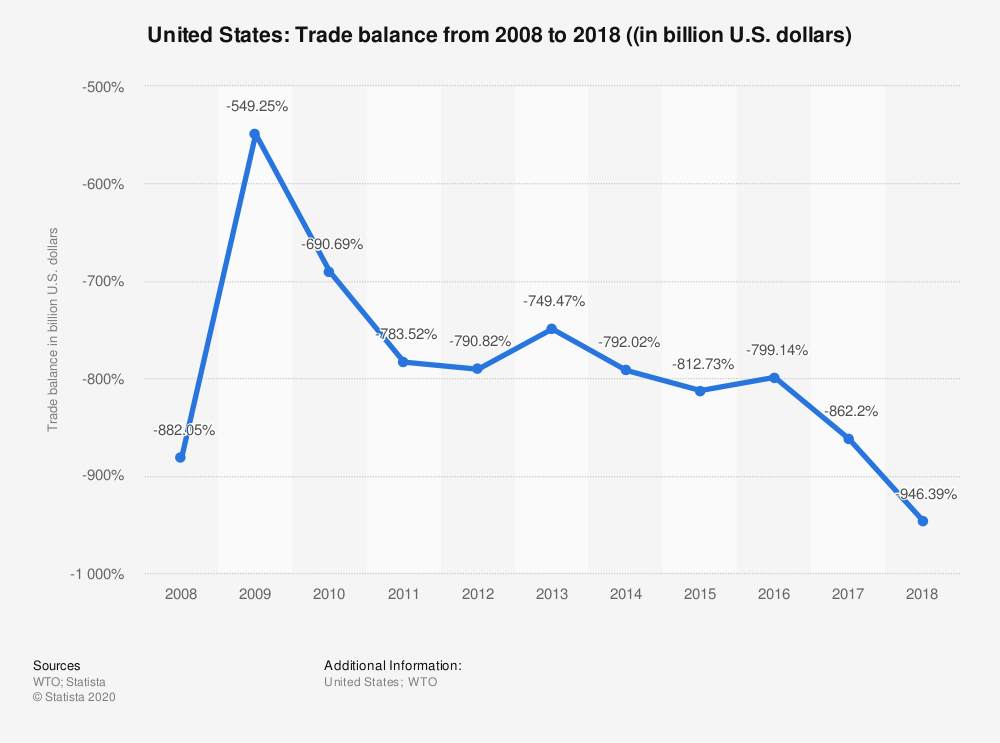The global economy experienced a temporary but relatively strong upturn from 2009 to 2012, followed by a brief interim slump in 2012 and 2013, which was followed by a long-term upturn up to the to the ‚Covid-19 recession‘ since the beginning of this year. The main factors behind this upswing after the ‚Great Recession’ were the uneven development of the world market, with emerging markets being less affected by recession than the developed capitalist centers, the dampening of the effects of the crisis through successful government rescue and economic stimulus programs, which were carried out in a temporary economic policy shift to the Keynesian economic paradigm, and the intervention of central banks. As a result of this renewed economic upturn, world trade recovered relatively quickly and grew again rapidly. As a result, the trade balance of the U.S. economy also fell significantly again from 2009 onwards, until it reached a historic negative value of around 946 trillion U.S. dollar in 2018 (see Fig. 7).